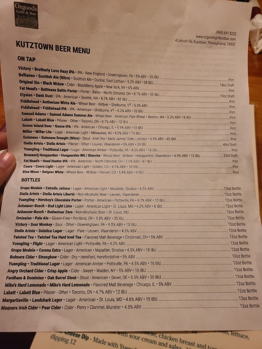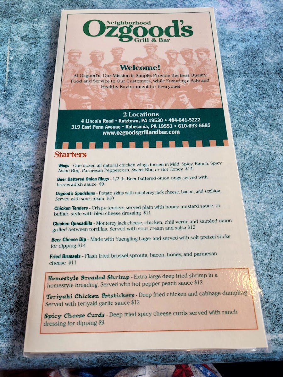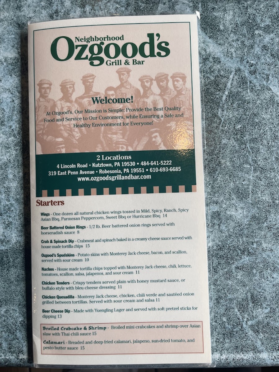 Welcome to Ozgoods Neighborhood Grill & Bar, a gem nestled in Kutztown, PA, offering a delightful menu that caters to diverse palates. Known for its inviting atmosphere and friendly service, Ozgoods serves a mouthwatering selection of burgers and sandwiches. Signature dishes include the Guinness Burger and Smothered Chicken Sandwich, both packed with flavor and generous portions.